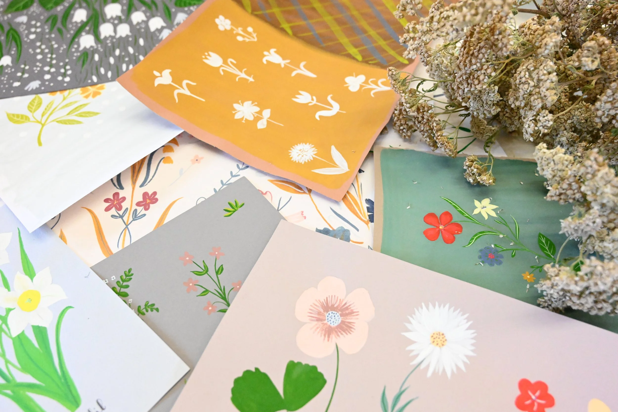 Assorted botanical illustrations and floral greeting cards with various colorful flower and plant designs, alongside dried flowers.